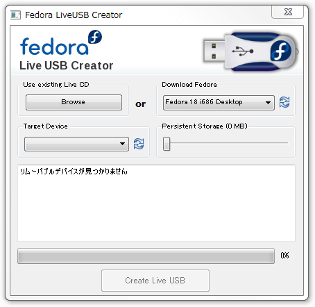 今回使用したのは、バージョン3.12.0。Fedora LiveUSB Creatorをインストールし起動するとこのようなウィンドウが表示される。