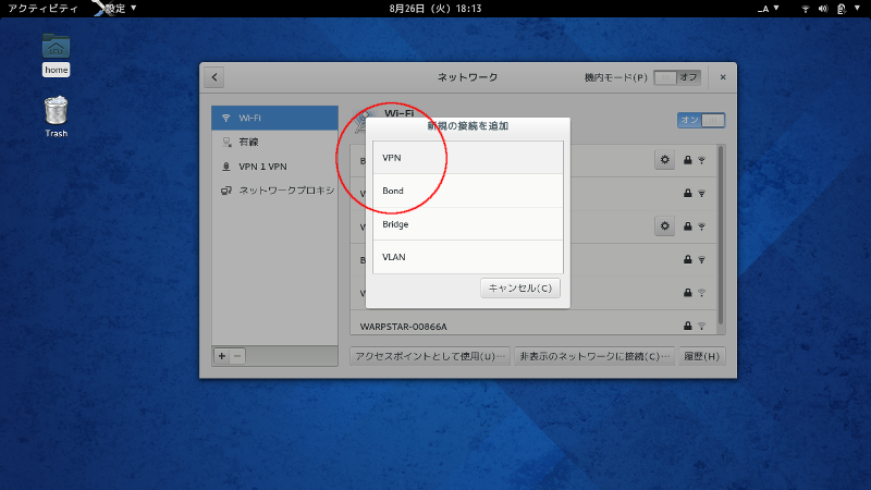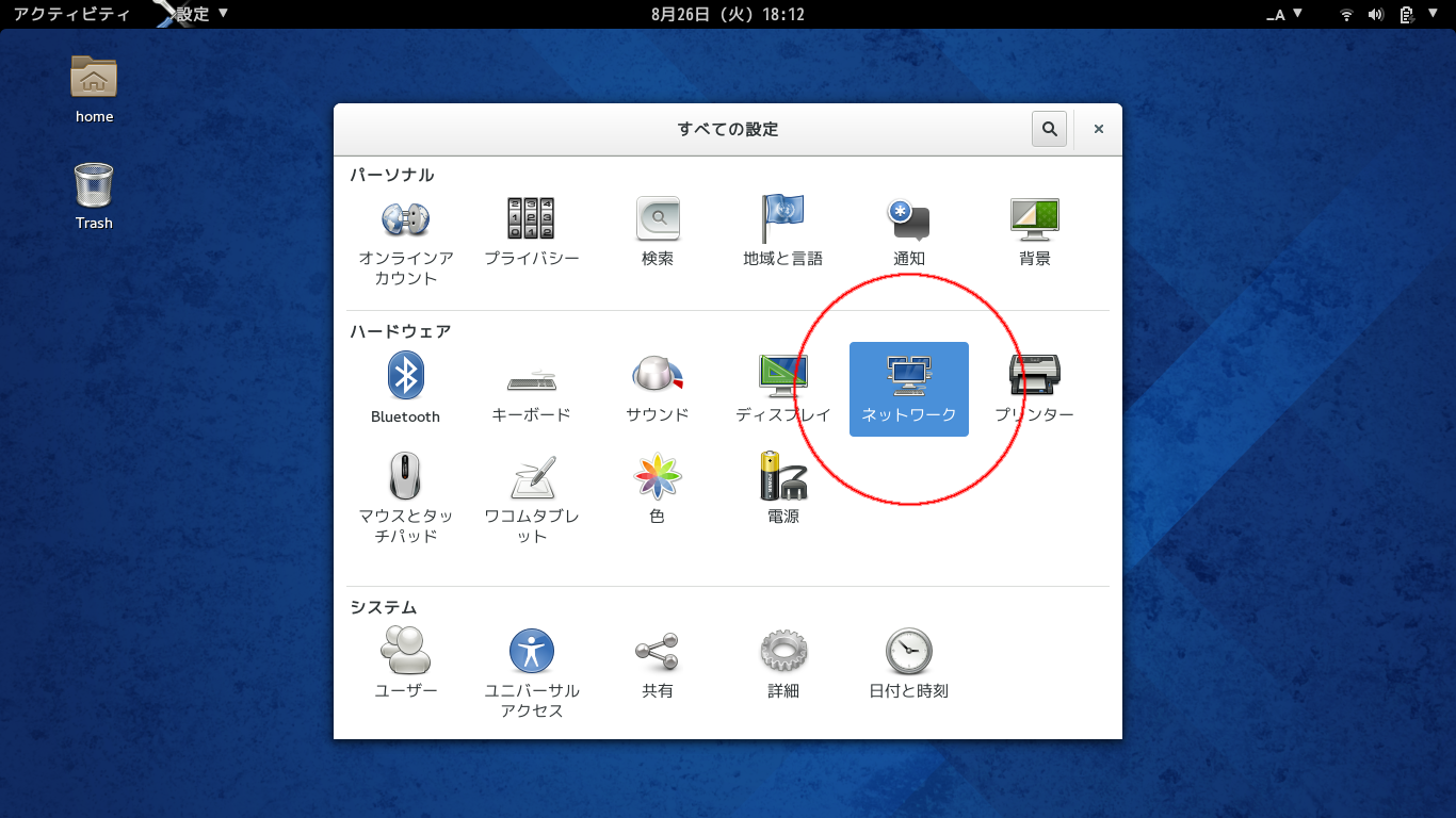Fedora20のネットワークマネージャーを使えば、VPN接続もGUIで設定する事ができる。ネットワークマネージャーにアクセスするには、アクティビティから設定を開きネットワークを選択すればよい。ネットワークの設定には、画面右上にあるアイコンが並んでいる箇所(名前が分からない。。。)をクリックしてもアクセスできる。ネットワークのON/OFFを設定するには右上からアクセスした方が早いので、今回はここから設定を始める。