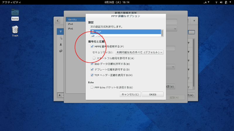 詳細なオプション内の、「MPPE暗号を使用する」にチェックを入れる。今回のルータの場合、ここにチェックを入れないと接続ができなかった。