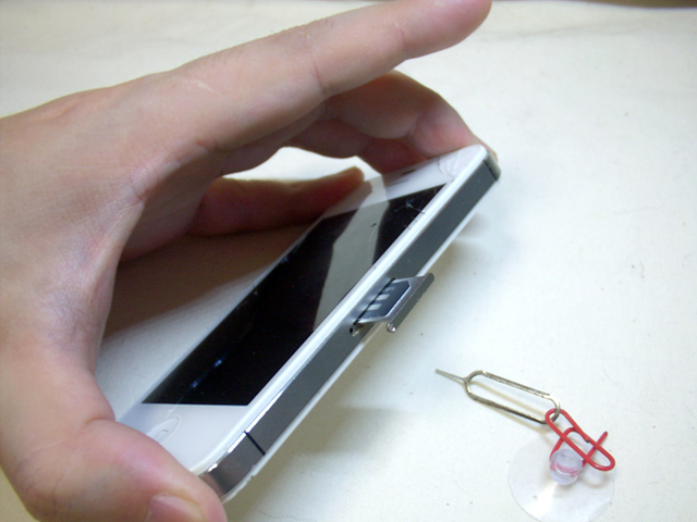 手始めに、交換KITに付属している工具の、microSIM取り出し工具を使ってmicroSIMを取り出す。右側面のmicroSIMのスロットに小さな穴があるので、そこに工具を差し込んでぐっと押し込むと、スロットが飛び出てくる。