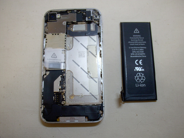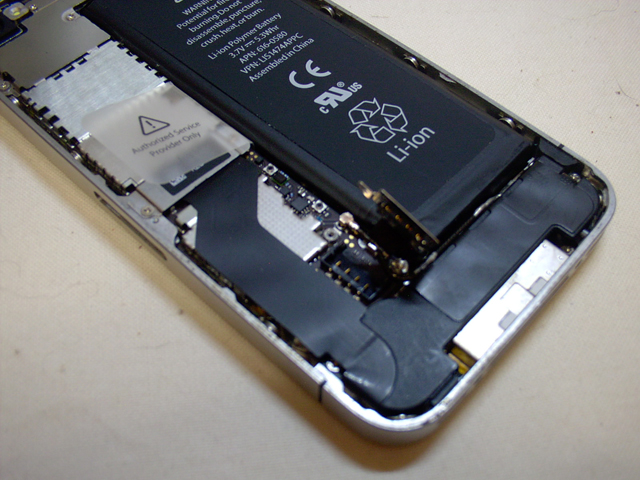 バッテリは両面テープで固定されているので、交換KITに入っているヘラを使ってゆっくりと持ち上げてやる。じわじわと持ち上げるとすこしずつはがれていって、最終的に本体からバッテリを取り外す事ができる。
