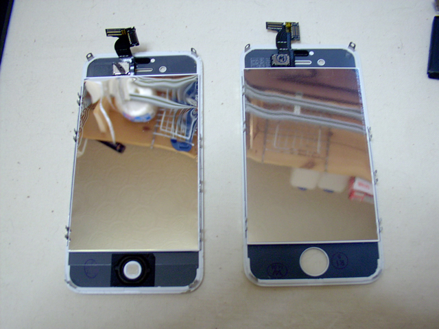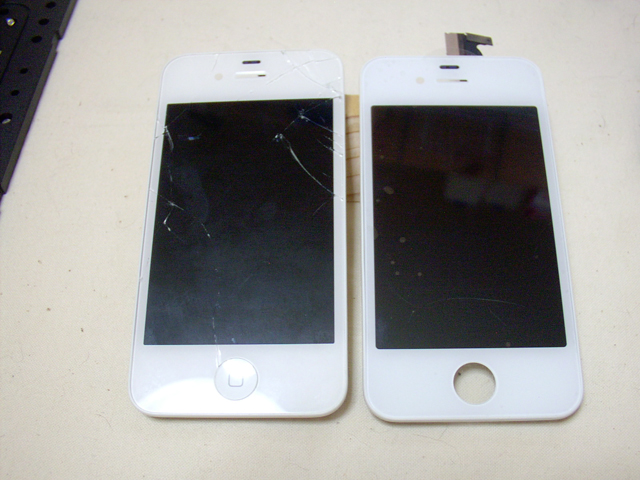 裏面。左が古いパネル、右が新しいパネル。下にホームボタンがシールで固定されているのが分かる。