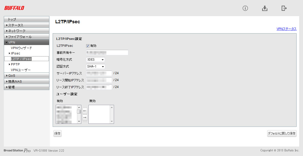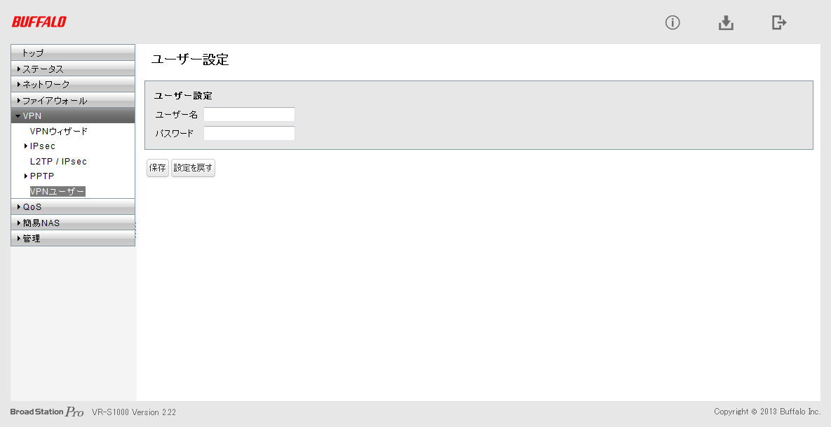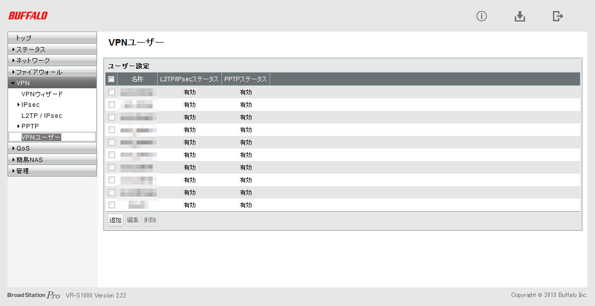 ユーザー名とパスワードを入力し、保存する。ユーザー一覧に新たに追加されているはずだ。必要なユーザーが追加できたら、続いてPPTP・L2TPサーバの接続設定をする。