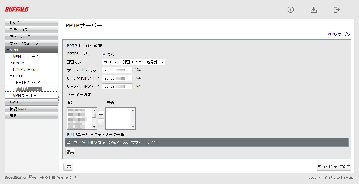 ユーザー設定欄では、先ほど設定したVPNユーザーの有効・無効が設定できる。PPTPを使って接続するユーザーを有効の方へ移動させておく。