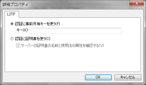 「詳細設定」ボタンを押すとプロパティウィンドウが開くので、「認証に事前共有キーを使う」を選択しキー欄にVR-S1000の設定で入力した事前共有キーを入力しておく。