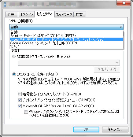 「セキュリティ」タブで、VPNの種類のプルダウンリストから「IPsecを利用したレイヤー2トンネリングプロトコル(L2TP/IPsec」を選択。プルダウンリスト下の「詳細設定」ボタンを押す。