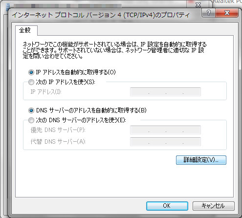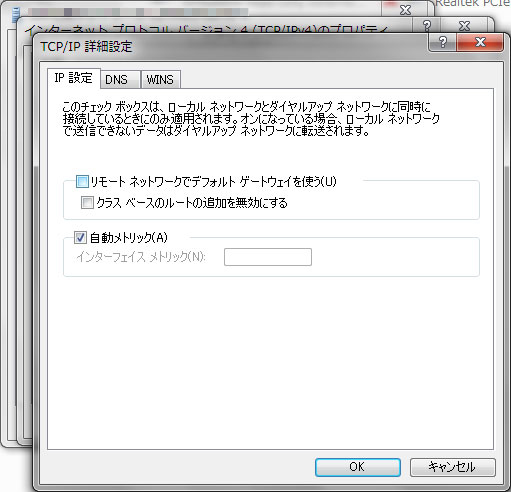 「TCP/IP詳細設定」の、「リモートネットワークでデフォルトゲートウェイを使う」のチェックを外し、「OK」を押す。